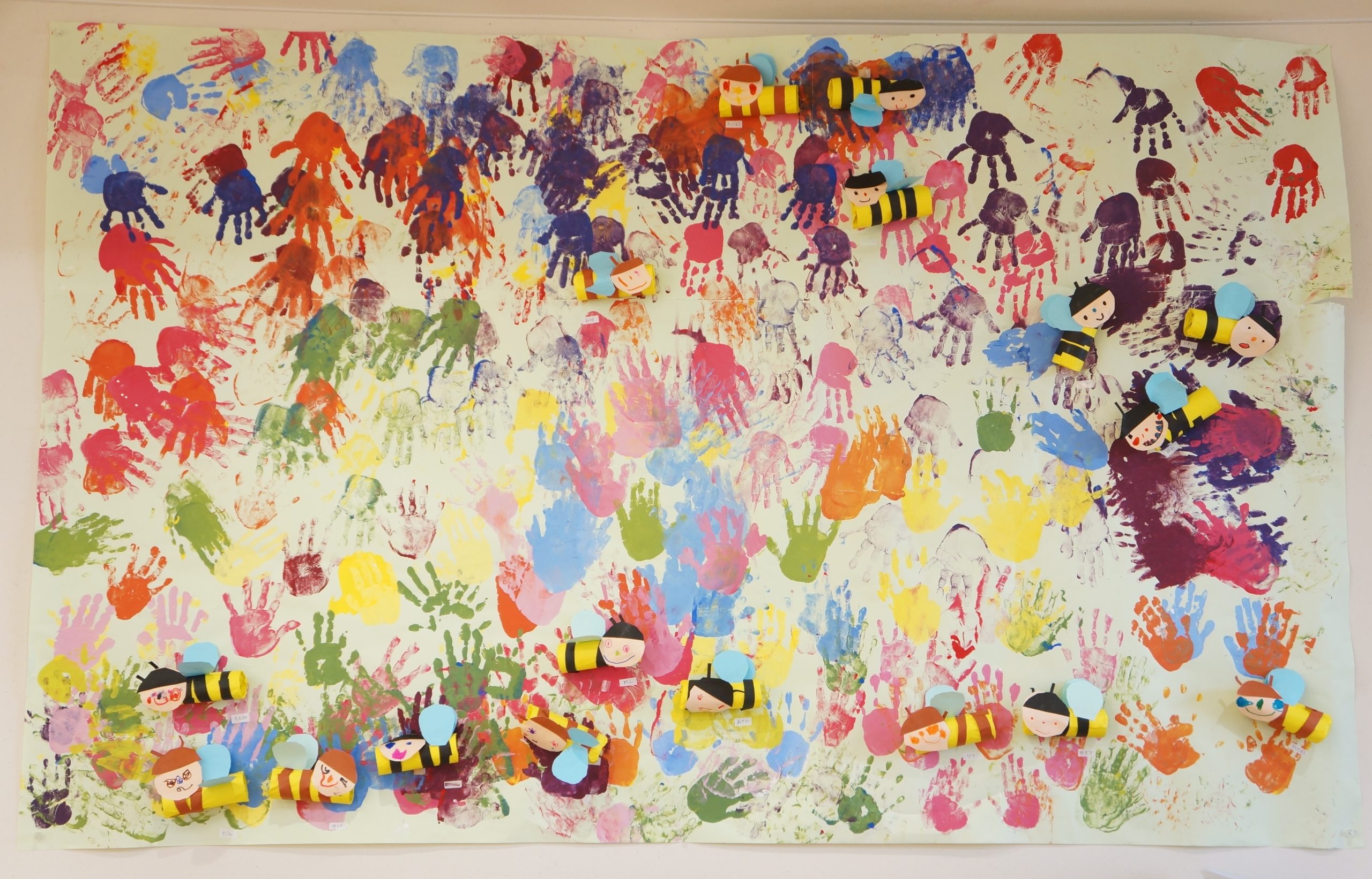 2026年3月9日🐝ばら組さんの壁面製作は「ミツバチと花畑」です。🌸 手形で描いた花畑を、かわいいミツバチさんが飛んでいます。 ミツバチさんはトイレットペーパーの芯を使って、立体的に作っています。 🌸少しずつ暖かくなってきましたね。もうす… 続きを読む