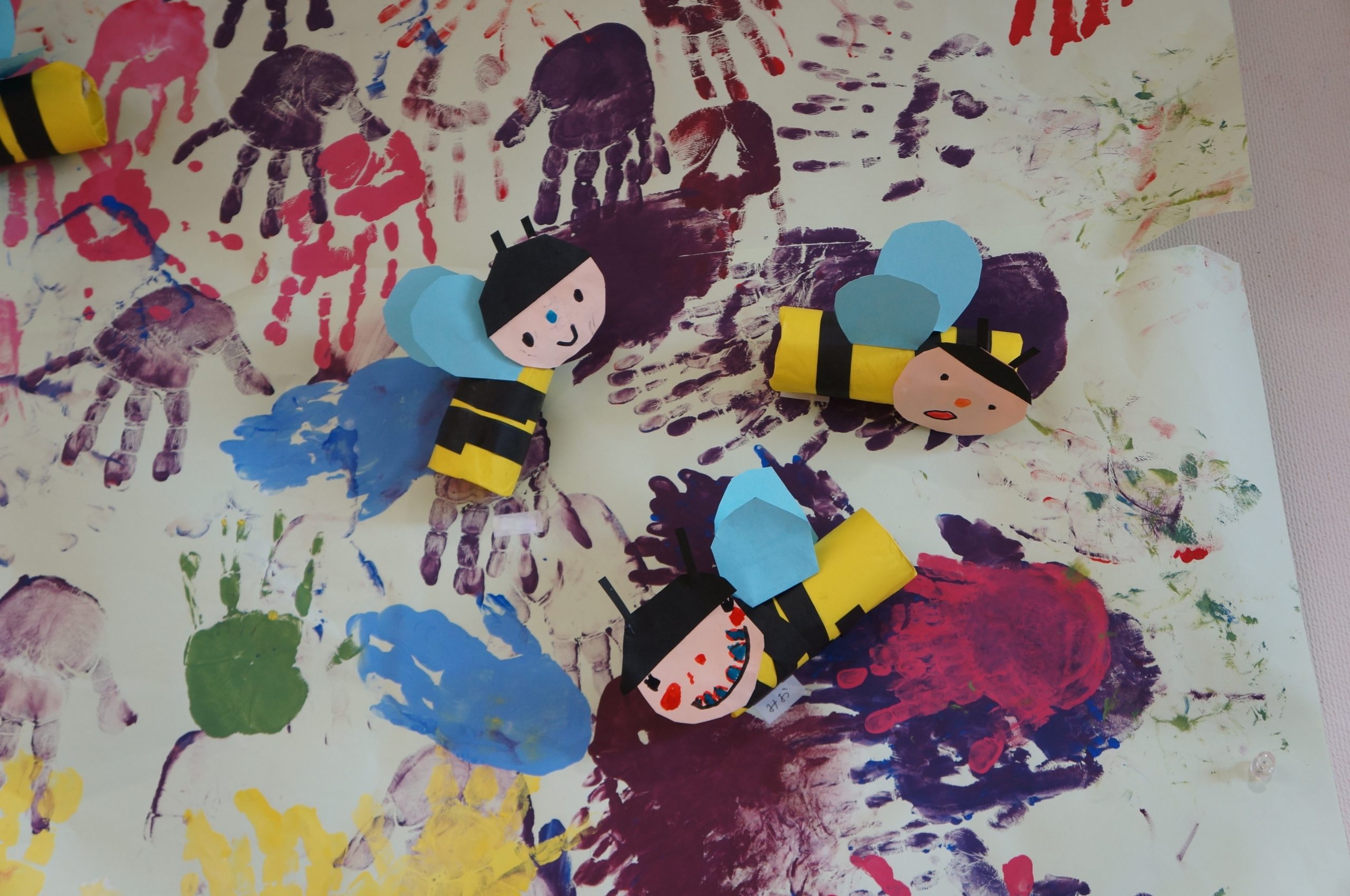 手形で描いた花畑を、かわいいミツバチさんが飛んでいます。