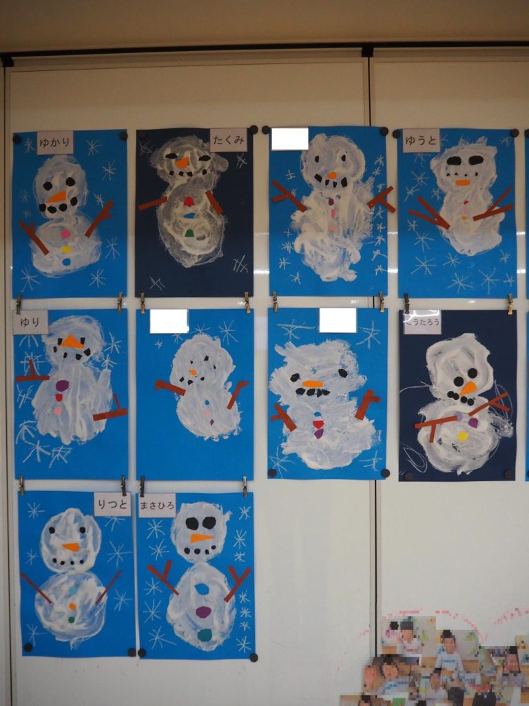 ゆきだるまの体は絵の具で描き、目や鼻などのパーツは画用紙を切り貼りしています✨