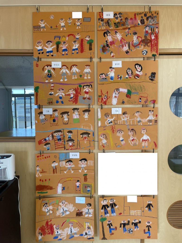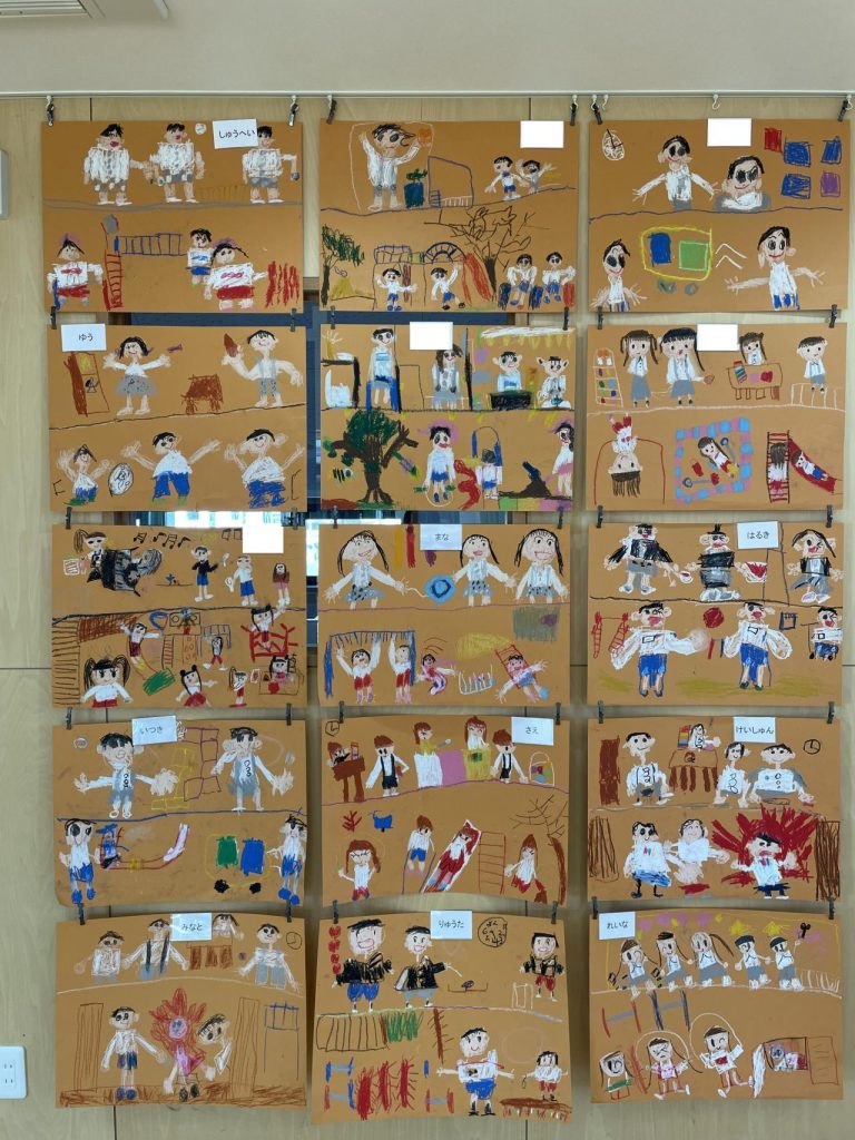 自分はコマで遊んでいるところ、お友達は折り紙で遊んでいるところ、と自分だけでなくお友達のことも思い出しながら描き進めている姿が印象的でした✨